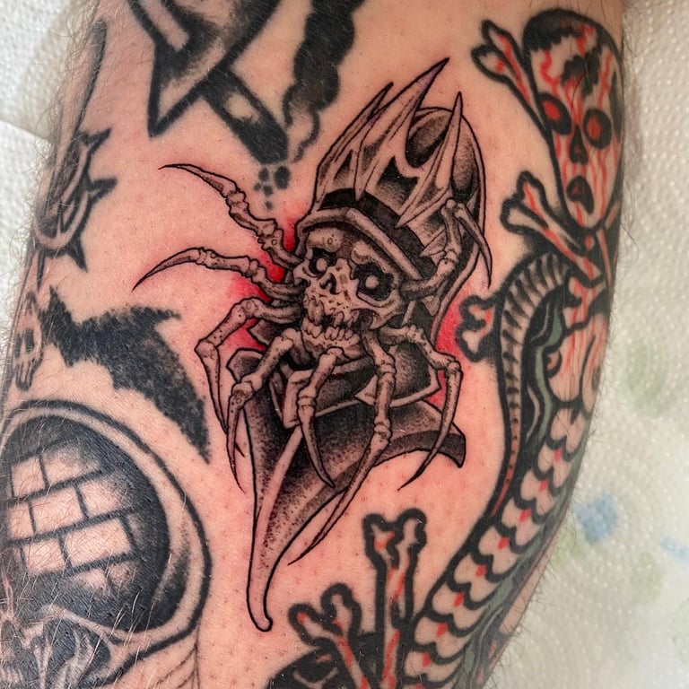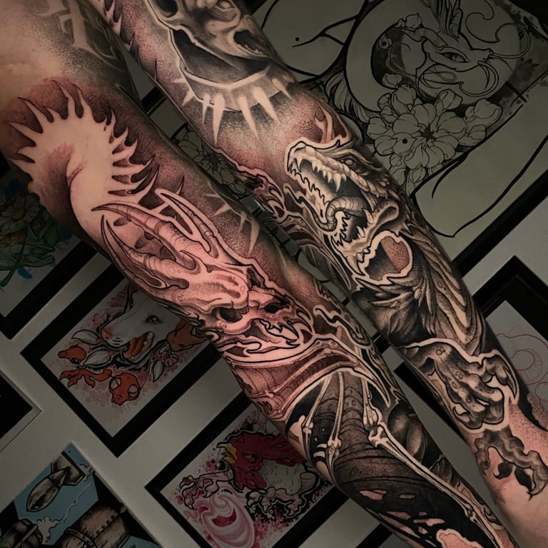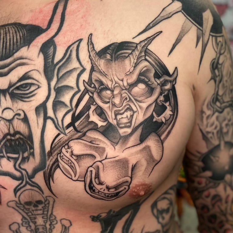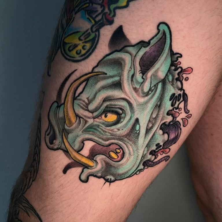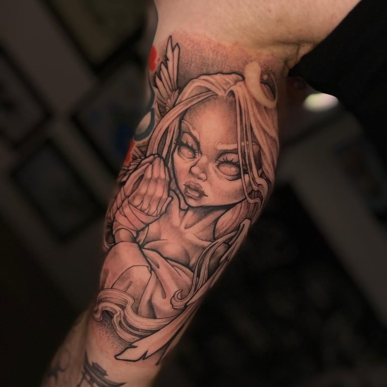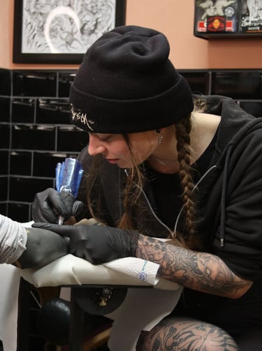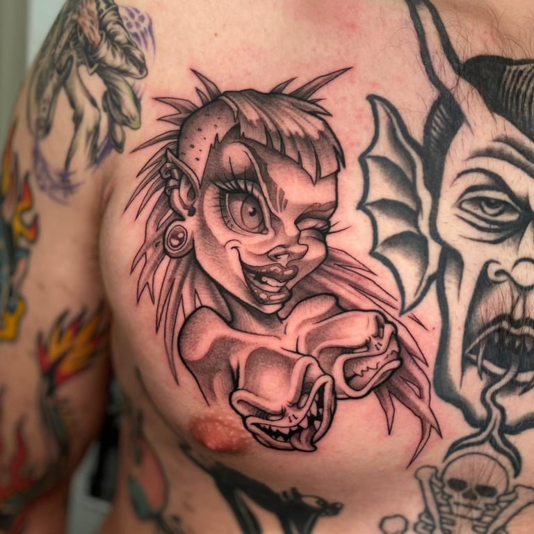 Hallo, ich bin Madita, auch bekannt als Mad. Ich tätowiere seit fünf Jahren hier in Berlin. Wenn ich nicht tätowiere, findet man mich oft mit einer Spraydose in der Hand. Das spiegelt sich auch in meinem Stil wider. Mein Herz schlägt für ausdrucksstarke, verrückte Tattoos, die sich stilistisch dem New-School-Bereich zuordnen lassen.