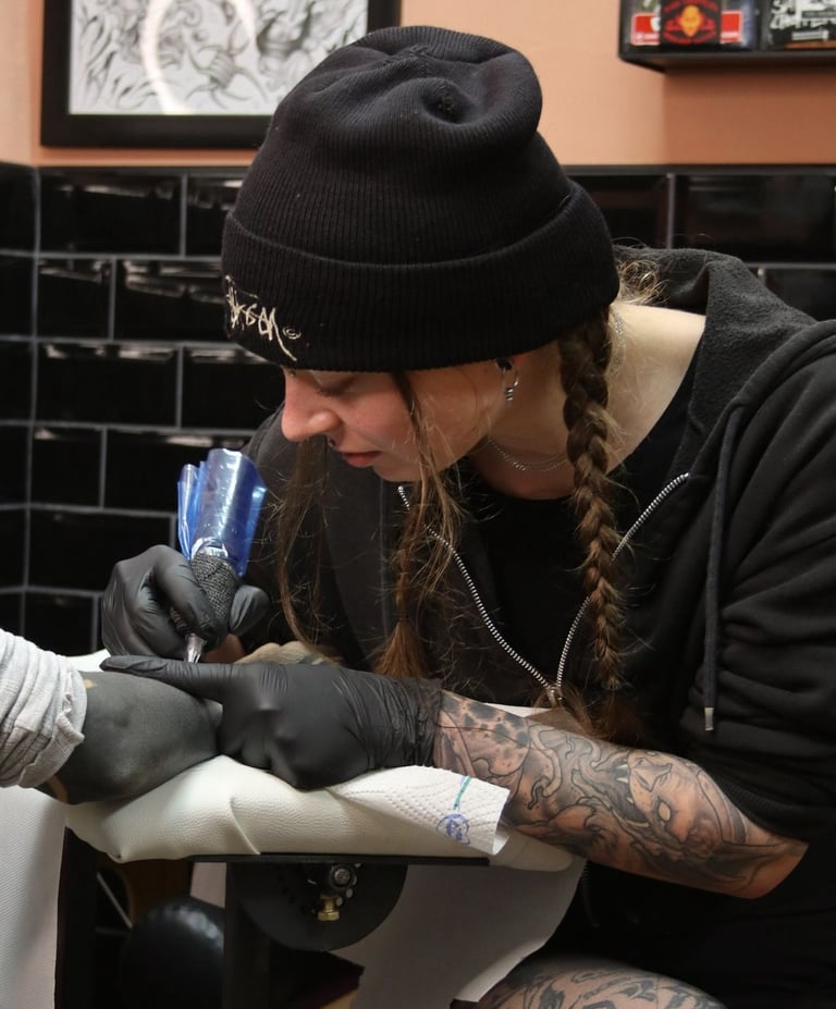 Hey, I’m Madita, aka Mad. I’ve been tattooing here in Berlin for five years. When I’m not tattooing, you can often find me with a spray can in my hand. That’s also reflected in my style. My heart beats for expressive, crazy tattoos that can be stylistically placed in the new school area.